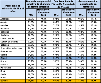 El indicador se obtiene a partir de la Encuesta de Población Activa, y los últimos datos disponibles, que corresponden al 3º trimestre de 2015, siguen mostrando una tendencia descendente, tanto a nivel nacional, como por Comunidades Autónomas. hecho, en la Comunidad de Madrid se ha reducido en casi 3 puntos, desde el 18,3% del año 2014 hasta el 15,5% de la media de los últimos cuatro trimestres, la mayor bajada, tras Baleares, que partía de niveles mucho más elevados. Esto sitúa a Madrid casi 5 puntos por debajo del total nacional y muy cerca del objetivo fijado para 2020, como se muestra en la tabla 1.