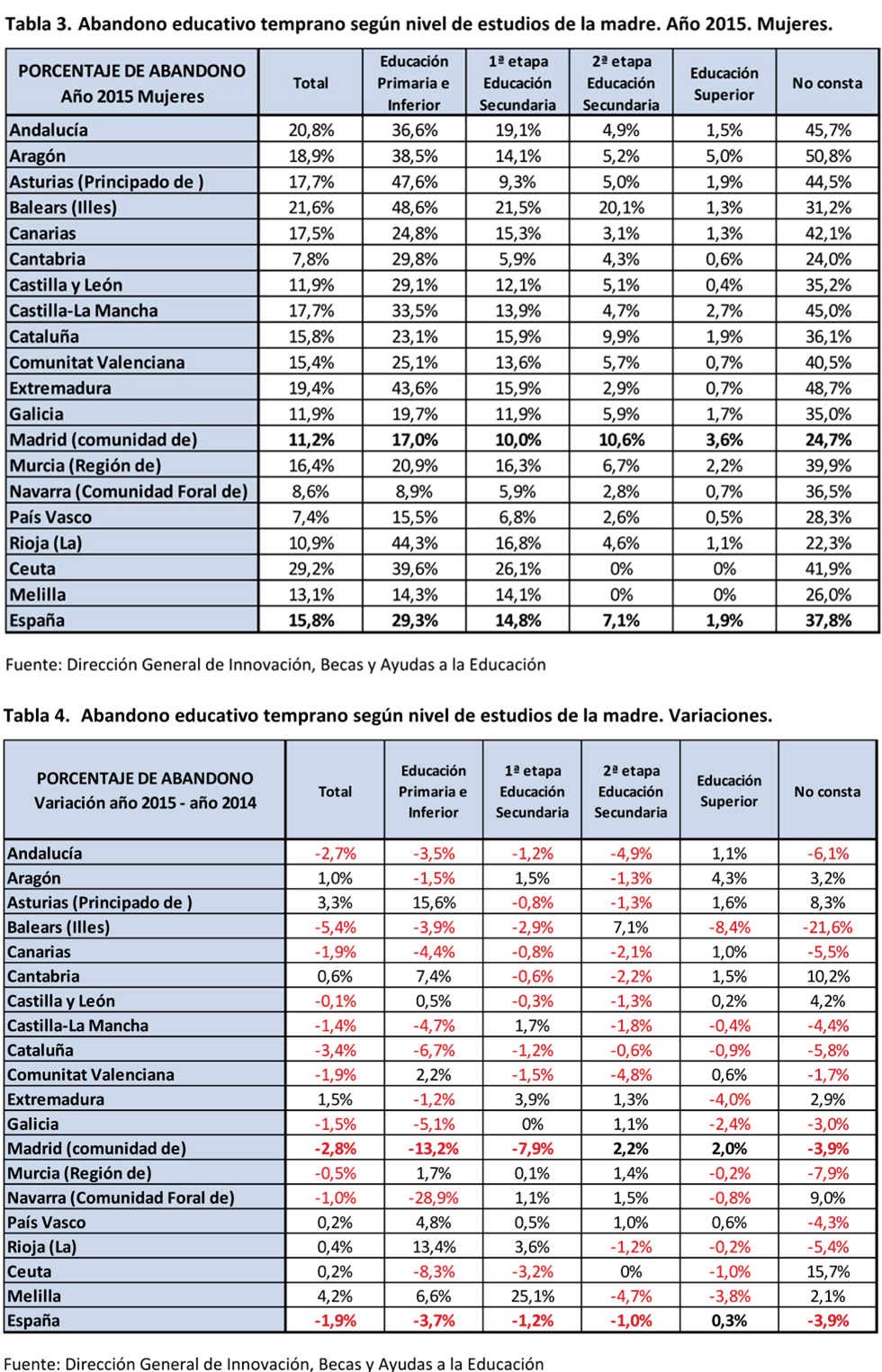 En la Tabla 4 se puede ver que, en comparación con el año anterior, Navarra y Madrid lideran la disminución del abandono en los hogares con menor nivel educativo de la madre, con una bajada del 28,9% y del 13,2% respectivamente, en el caso de Educación Primaria o inferior. En el caso de Educación Secundaria de primera etapa, Madrid lidera la disminución con una bajada del 7,9%. A nivel nacional estas disminuciones no son tan acentuadas.