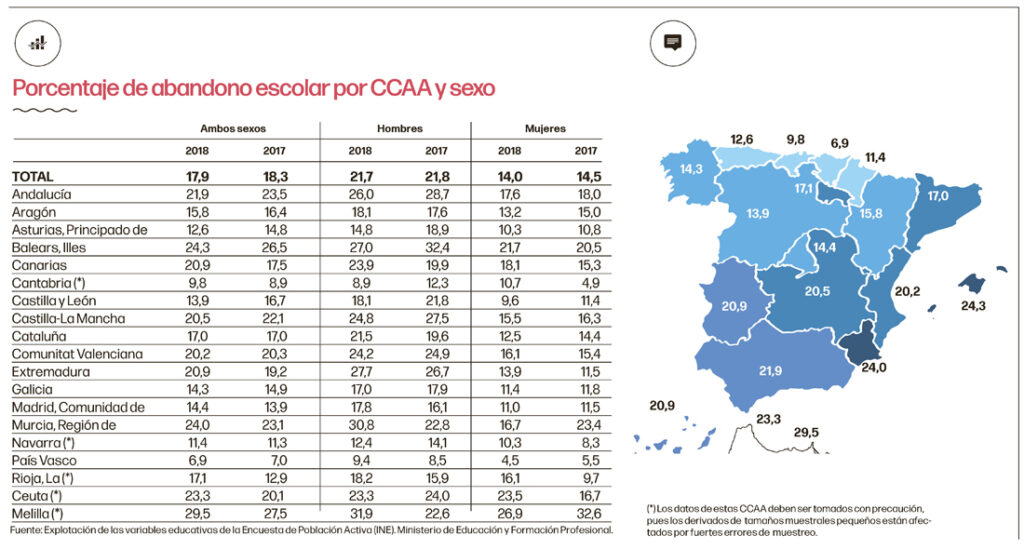 En cuanto al abandono escolar temprano, Gortázar hace referencia al hecho de que los datos de 2018 de la Encuesta de Población Activa (EPA) muestren cierto estancamiento: “Habrá que esperar a la EPA de finales de abril, del primer trimestre de 2019, pero hay señales de parón. El abandono estructural ha bajado mucho en los últimos años, y no todo por la crisis. Ha calado la idea de que estudiar más allá de ESO es bueno. No volveremos al 32% de inicios de 2000, porque no creceremos al 4%, pero que oscilemos entre el 15% y el 20% puede ocurrir, lo que es poco deseable cuando hay comunidades como el País Vasco o Cantabria que rondan el 7% y la media europea está en el 10%”, analiza.