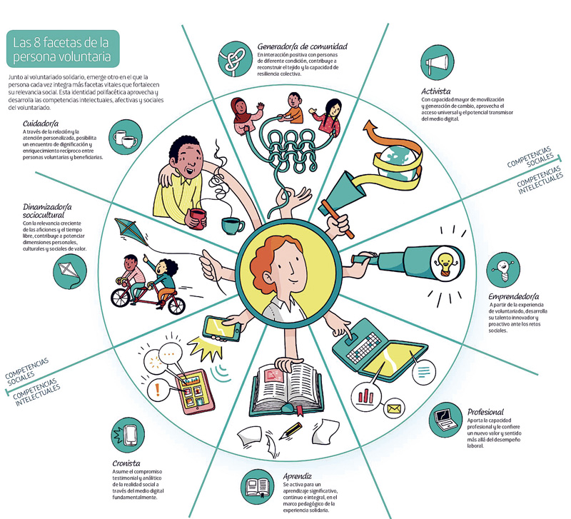 - Sigue vinculado a formas organizativas y tradicionales de voluntariado, pero también puede desenvolverse de manera simultánea, autónoma y proactiva en diferentes iniciativas que contribuyan a una causa mayor.