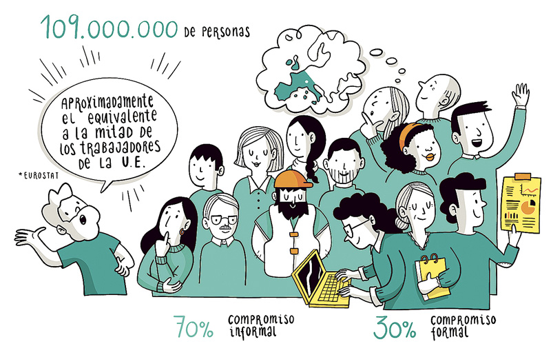 Como se puede ver en la ilustración de abajo, la fuerza de trabajo voluntaria mundial equivale a la de 109 millones de trabajadores a tiempo completo, cifra que supera a la de muchas de las principales industrias mundiales. De estos 109 millones, el 30% corresponde a servicio voluntario que se realiza formalmente a través de organizaciones, asociaciones y grupos. La mayor parte de la actividad voluntaria global (el 70%), que es también la más difícil de captar y la que suele ser menos visible, se realiza directamente a través del compromiso informal entre personas.