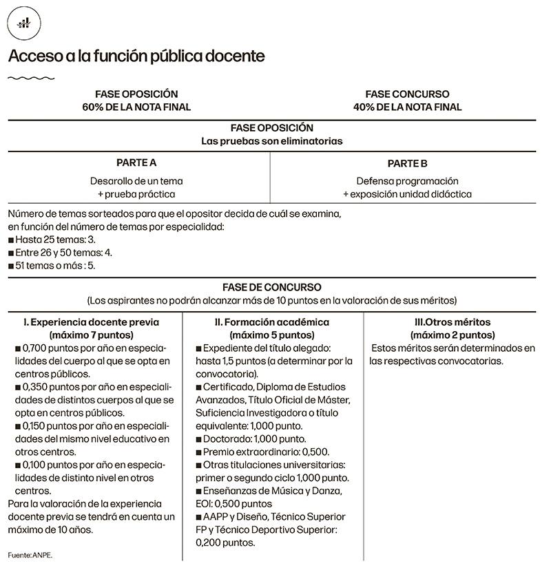 Consejos aportados por Daniel Turienzo (aprobó las oposiciones en 2017, presidente de tribunal en 2019, Infantil), Lucía García Jartín (se graduó, hizo el máster de Secundaria y aprobó las oposiciones en 2019, Biología y Geología), y los funcionarios docentes en Secundaria, Bachillerato y FP Toni Solano, Diegu San Gabriel, Alberto Royo, Alberto Cifuentes (también miembro de tribunal) y Soraya Chapinal.