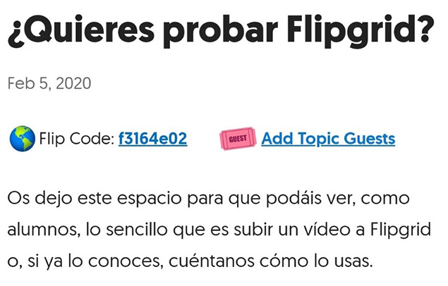 En mi experiencia personal, Flipgrid me ha sido muy útil para promover el sentimiento de comunidad y de grupo en la enseñanza online y he tenido respuestas tan maravillosas como vídeos de madres acunando o paseando a sus niños mientras graban sus respuestas, otros vídeos en grupo debatiendo sobre un tema o vídeos en el exterior, ambientados en plena naturaleza. Todos ellos, por supuesto, sin haberlos pedido así, simplemente por haberse creado un ambiente que propiciaba la confianza y las ganas de compartir con el resto de los compañeros.