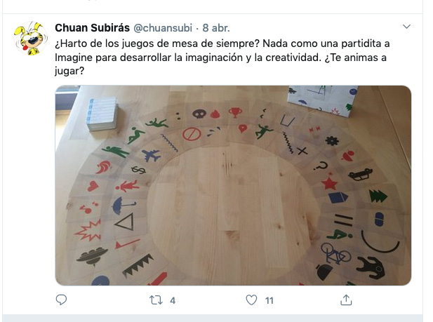 El juego que recomienda es “Imagine”, un juego de mesa con cartas transparentes en las que aparecen diferentes símbolos y dibujos que, al superponerlos o incluso darles movimiento, nos ayudarán a que nuestros compañeros de equipo puedan descubrir que es lo que estamos “dibujando. “ Me gusta, no solo por el trabajo creativo y resolutivo que lleva por parte del jugador, sino por la versatilidad del mismo. Aparte del uso que le dan las normas propias del juego, el poder crear historias con los diferentes elementos o el uso de la comunicación no verbal como medio de expresión, puede dar bastante juego en el aula”.