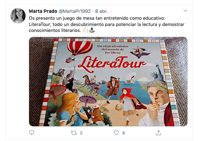 Prado utiliza el juego en el aula y reconoce sus beneficios. “Enseñar mediante el juego hace que el aprendizaje sea adquirido de manera mucho más eficaz y duradera”. Uno de los juegos que suele utilizar en clase es LiteraTour [+ 8 años. 2 a 4 jugadores]. “Tiene diferentes niveles de complejidad y consiste en demostrar conocimientos literarios. Me encanta porque promueve la lectura de los alumnos, ya que cuanto más lean, más conocimientos tendrán para ganar la partida”.