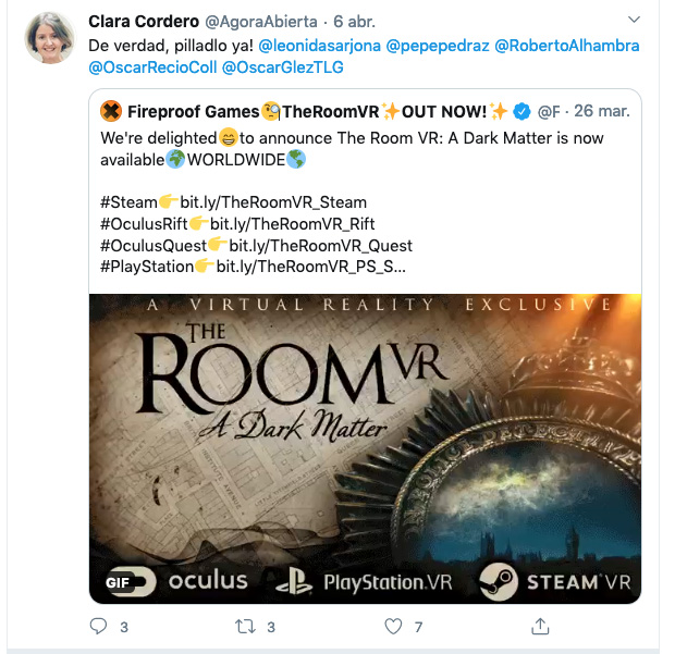 Nos recomienda el último juego al que ha jugado y que le tiene maravillada. Aprovecha la realidad virtual para lograr una inmersión perfecta. Se llama The Room:A Dark Matter y propone una serie de acertijos y enigmas con una narrativa impactante. La idea del juego es que desarrolles competencias que van desde la asociación de elementos y conceptos a la comprensión de un hilo conductor muy atractivo que pone en marcha la propia comprensión del mundo que te rodea. “Me gustan mucho los juegos de exploración y descubrimiento con un ritmo dinámico y asequibles. Son los que hacen que tu cerebro se ponga en funcionamiento y realice conexiones. La realidad virtual es una apuesta perfecta para las simulaciones y el aprendizaje basado en la experiencia”.
