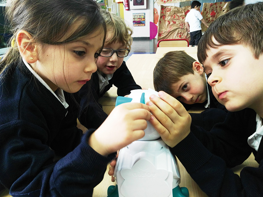 Hemos introducido en el aula un robot que tiene Inteligencia Artificia y se llama AISOY. A los alumnos se les presentó como un amigo que había sido enviado de otro planeta y teníamos que despertarle y ayudarle a integrarse como un alumno más: “está dormido. Le despertamos y tenemos que intentar no asustarle. Cuando despierta, podemos hacerle preguntas”. El profesor, mediante la aplicación diseñada, puede escribir las respuestas y el robot las dice.