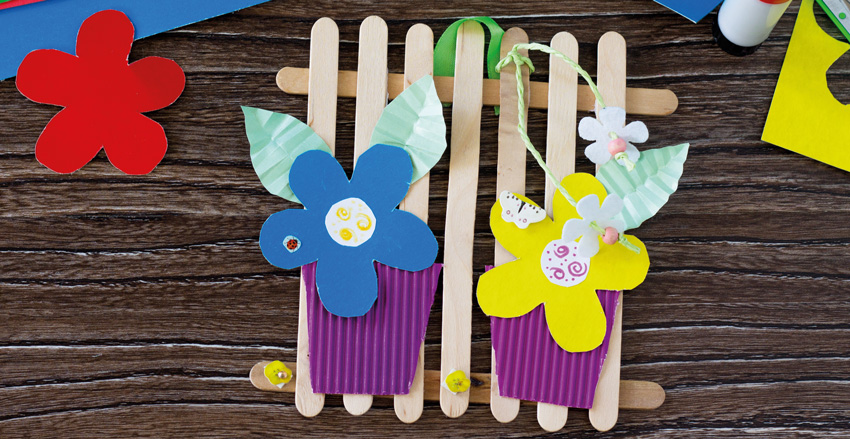 3 – Pegamos las macetas, las hojas, las flores y, por último, los insectos y el círculo interior de la flor. También pegamos una tira por detrás de la vaya para poder colgarla después.