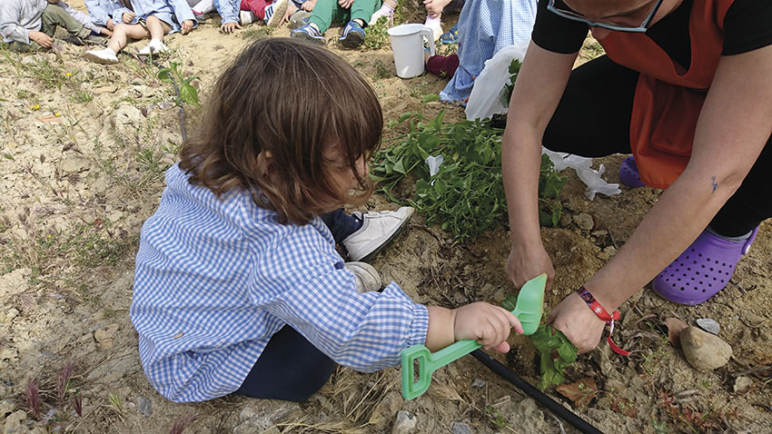 • Salida a sembrar las plantas. Las plantas se distribuyen por aulas y los niños ayudan con un kit de jardinero o de la playa a hacer los agujeros para sembrar.