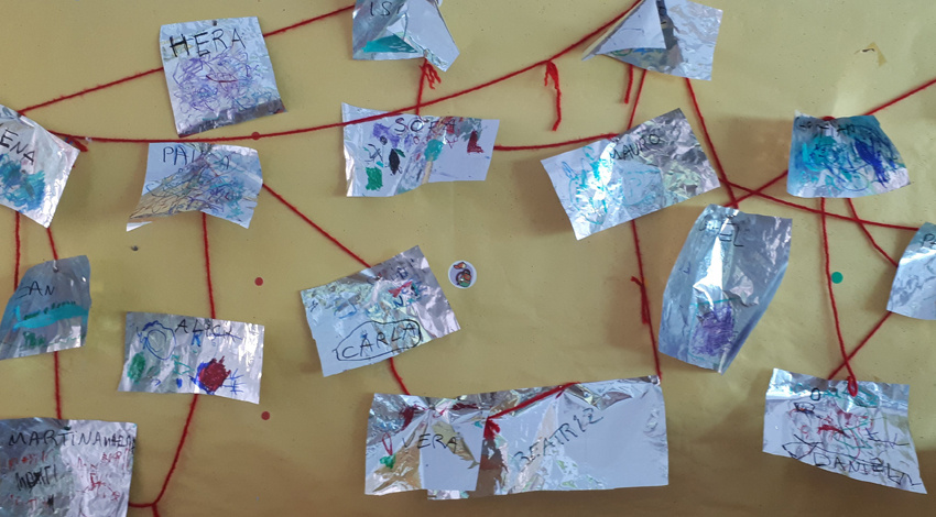 • Las cajas-casa: Cada niño y niña crea un espacio en el aula donde encontrarse con sus familias a nivel emocional. Para ello, se solicitan cajas y una foto familiar para que cada cual prepare y decore su caja a modo de espacio de seguridad y juego, con el que aportan a la escuela un mapa de identidades. Cada familia habita la escuela a través de la caja-casa, donde los niños crean y cambian, como una ciudad y sus habitantes. Desde las cajas-casa, se crea un recorrido emocional por la escuela y la familia, que cambia constantemente.