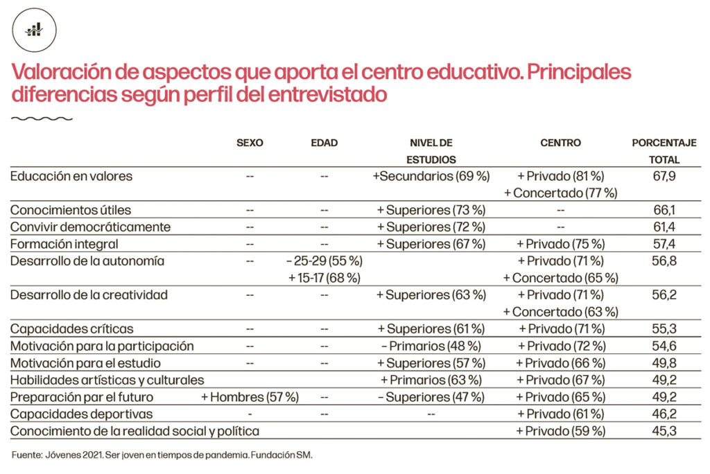Los jóvenes con estudios universitarios destacan particularmente en señalar la adquisición de conocimientos útiles, el aprendizaje para convivir democráticamente, la formación integral, el desarrollo de la creatividad, las capacidades críticas y la motivación para el estudio. Sin embargo, siempre sin perder de vista que estamos ante una valoración muy subjetiva, estos jóvenes que han completado los estudios universitarios o equivalentes consideran menos que la media que el centro en el que han estudiado les ha aportado preparación para el futuro.
