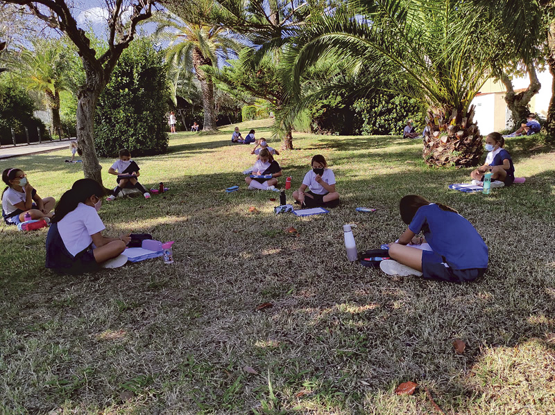 Iniciativas que podemos ver en primera persona desde que el Colegio “Sagrado Corazón de Sarrià”, ubicado en la ciudad de Barcelona, nos abre sus puertas para enseñarnos el nuevo funcionamiento en tiempos de Covid. Observamos cómo el colegio ha transmutado las clásicas y tradicionales tutorías en aula en modernas sesiones al aire libre. Los estudiantes se sientan en un círculo grande que termina cerrando la tutora; desde allí alumnos charlan animadamente y expresan dudas, reflexiones y preocupaciones a su tutora.