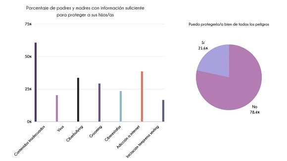 Un 60% afirma que los tiene para protegerlos de contenidos inapropiados (violentos, pornográficos…). Además, un 83% afirma no tener suficiente información para proteger a su hijo/a de la iniciación temprana en el sexting. Un 79% reconoce no saber suficiente como para proteger a sus hijos de los virus informáticos. Un 76% necesitaría más información para protegerlos de las ciberestafas. Y un 70% dice no tener suficiente información para proteger a sus hijos del ciberacoso pedófilo. Un 66% afirma no poder protegerlos del ciberbullying. Y un 61% declara no poder protegerlos bien de la adicción a internet.