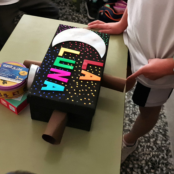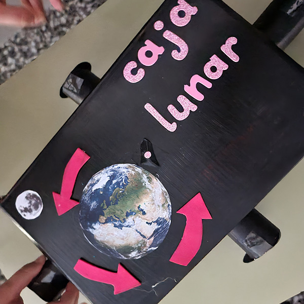 Como tarea final se propuso a los alumnos realizar una sencilla propuesta con sus familias, la cual consiste en llevar a lo palpable lo visto con realidad aumentada, y crear una sencilla caja lunar. Es importante que no nos quedemos en los aspectos digitales, como los trabajados con el cubo merge o con vídeos explicativos, y que además podamos ir un poco más allá del procesado y análisis de las informaciones obtenidas y todos los contenidos que se incluyen en la unidad didáctica. El alumno también debe manipular, mancharse las manos, tocar, y sobre todo crear algo. Para realizar una caja lunar necesitaremos materiales sencillos, como una caja de zapatos, rollos de papel higiénico, pintura, una pequeña linterna y una bola de corcho. La idea es sencilla: crear una caja negra por dentro, con cuatro visores centrados, uno en cada lateral de la caja, hechos con rollos de papel higiénico. En la parte de arriba se cuelga una pequeña bola de corcho blanco que será la Luna, y finalmente en una de las caras de la caja se pone un pequeño punto de luz no muy potente. Al observar la bola por los visores se observan las cuatro fases de la luna.