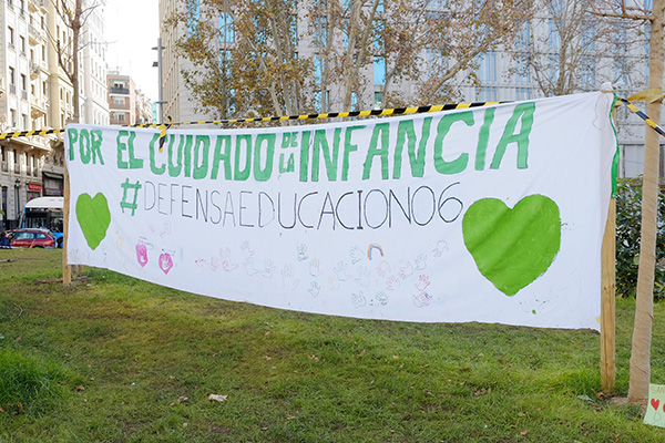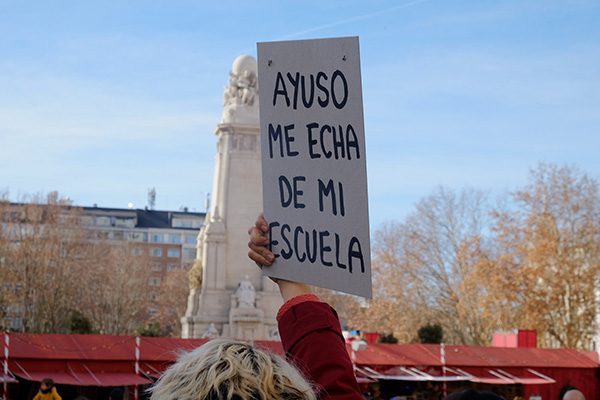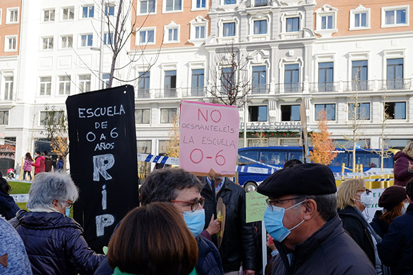 Las nueve escuelas infantiles públicas de la Comunidad de Madrid se movilizaron el pasado sábado 11 de diciembre al mediodía en la Plaza de España para protestar contra la intención del Gobierno de Isabel Díaz Ayuso de cerrar el tramo de 3 a 6 años para transformar esas plazas en 0 a 3 años.