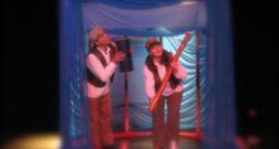 La acción con varas y telas conforma un espacio para el juego: cielo que se convierte en techo, paredes paisaje, casa universo que se teje y desteje para que finalmente cada espectador se lleve parte del tejido en el que pondrá su propio rostro como hilo.