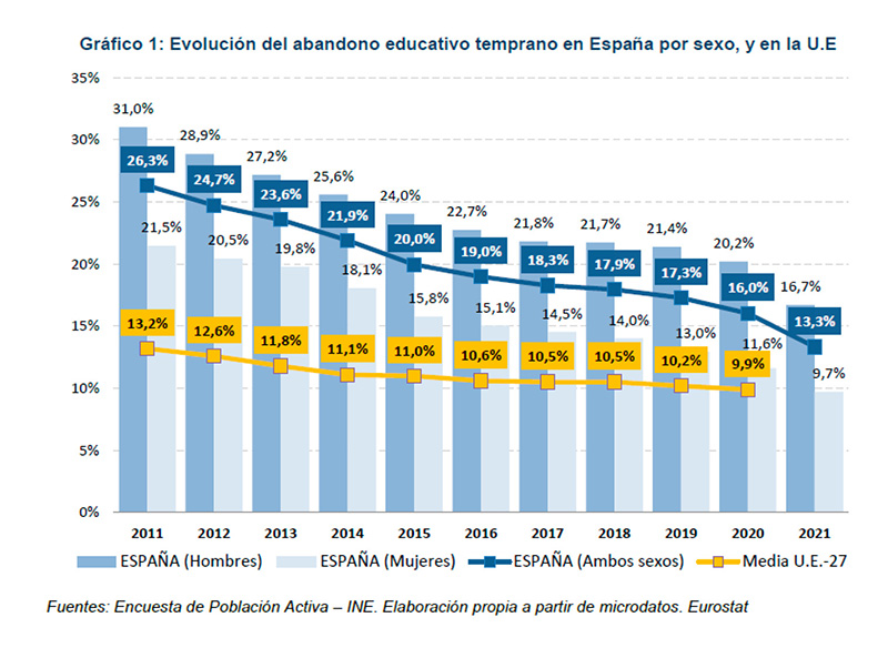 Con una media nacional del 27,7%, las comunidades y ciudades autónomas con mayor porcentaje de personas de 24 a 34 años con la titulación más baja (hasta ESO) son Melilla (41,2%), Ceuta (38%), Extremadura (37,3%), Murcia (36%), Castilla-La Mancha (34,29%), Andalucía (34,2%) y La Rioja (30,7%).