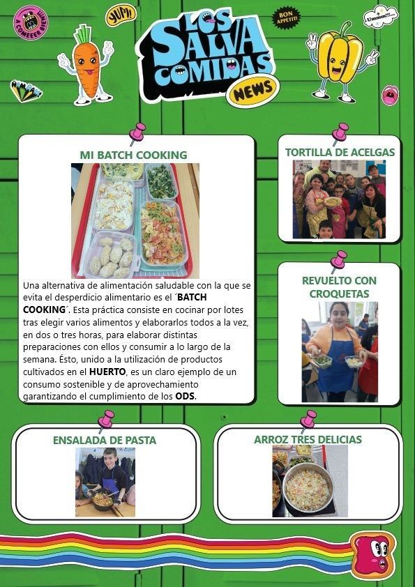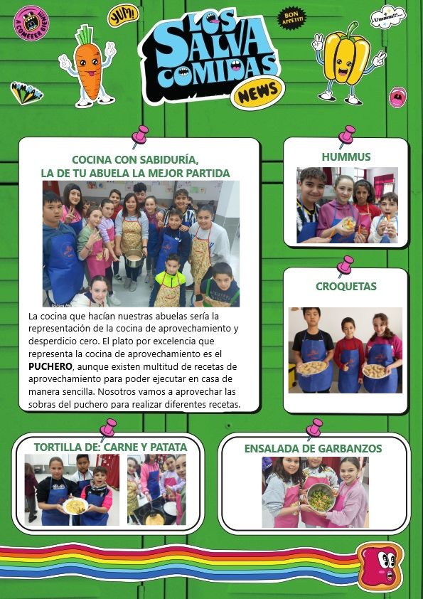 Los ganadores han sido tres grupos escolares y un grupo de scouts: el Colegio Público Taxara, de Huétor Tájar, en Granada, ya resultó ganador en la edición anterior y repite en esta ocasión con dos trabajos. Por un lado, en 3º y 4º de Primaria, presentó una portada titulada ‘Mi batch cooking’, una práctica que consiste en cocinar por lotes tras elegir varios alimentos y elaborarlos todos a la vez y conseguir distintas preparaciones para consumir durante la semana. En 5º y 6º de Primaria, el alumnado de Taxara también ha ganado con el trabajo titulado ‘Cocina con sabiduría, la de tu abuela la mejor partida’, inspirado en la forma de cocinar de sus abuelas como ejemplo de aprovechamiento y desperdicio cero. Aprovecharon las sobras del puchero para elaborar diferentes recetas, como hummus, croquetas, tortilla de carne y patata y ensalada de garbanzos.