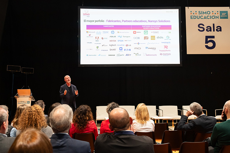 Roberto Milán introdujo Nunsys, un gran grupo con sede en Valencia que dispone de una estructura de más de 3.000 profesionales, ofrece cobertura comercial nacional e internacional gracias a sus 27 delegaciones y da respuesta a las necesidades de sus clientes a través de sus 200 asesores comerciales especialistas y sus 12 unidades de negocio. Milán explicó que “con el lanzamiento de nuestro vertical, Nunsys apuesta de forma clara por el sector educativo, poniendo a su disposición nuestra gran estructura y experiencia tecnológica de más de 40 años”. “Estamos muy cerca de cualquier centro educativo, colegio, universidad, escuela de negocios, FP. Podemos dar cobertura global, solución y servicio para cualquier necesidad que un centro requiera”, añadió.