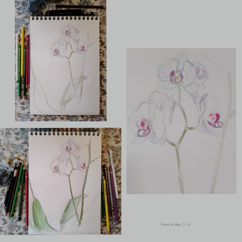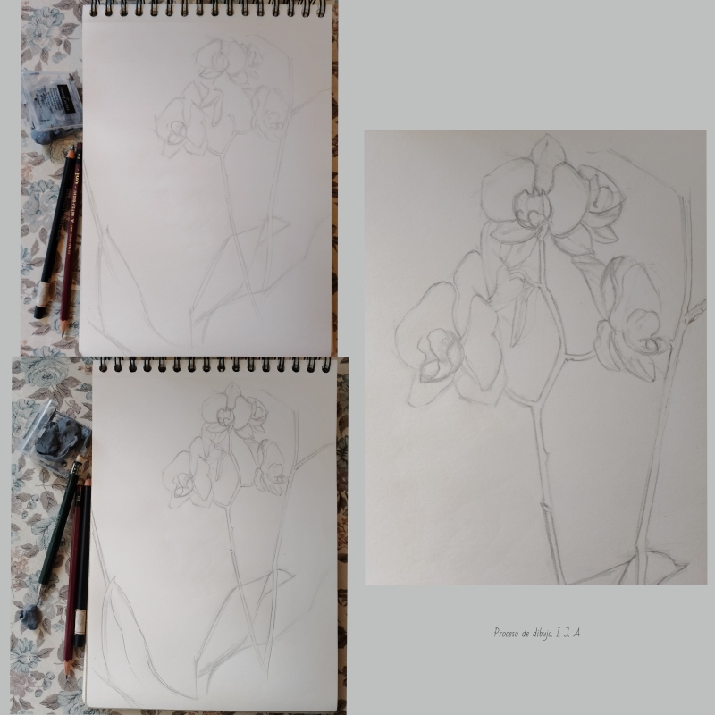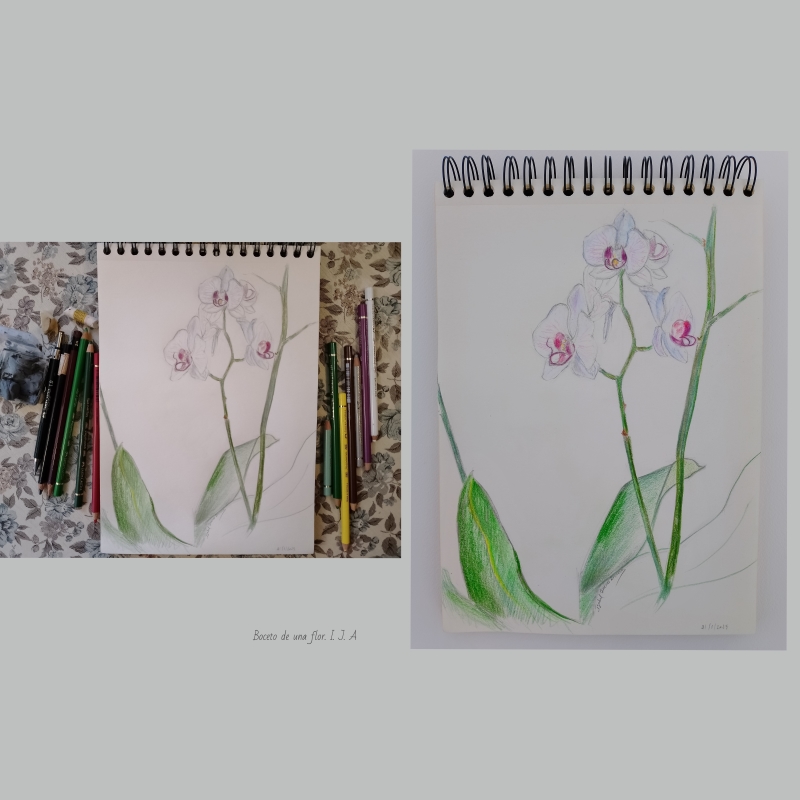 Los materiales serán lápiz blando, goma y lápices de colores. Además, un portaminas puede ser útil para definir detalles. Si las flores son blancas, dependiendo del color del papel que estén utilizando, convendrá dejar espacios sin rellenar si es blanco, o utilizar lápiz blanco o cera blanda blanca para las zonas más claras sobre papel de otro color. En general utilizarán materiales a los que estén ya acostumbrados porque el objetivo de esta actividad no es realizar un dibujo o pintura completas. Hay que tener en cuenta que no se trata de una obra acabada. Están realizando un apunte, un sketch de unas flores. Por lo tanto, las líneas de encaje permanecerán en el dibujo hasta el último momento y serán una guía. Solo al final, cuando sientan que su boceto está suficientemente completo, podrán borrarlas parcialmente.