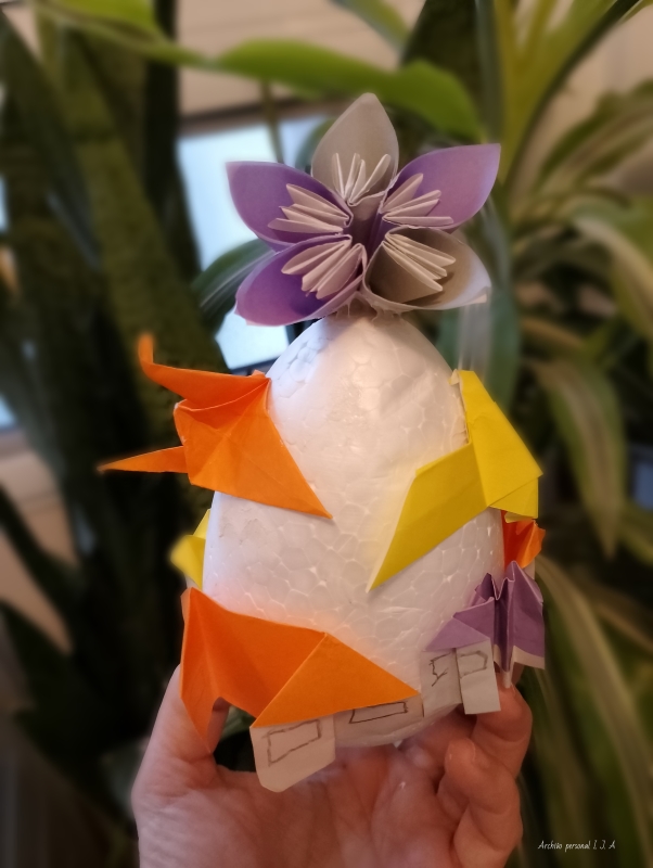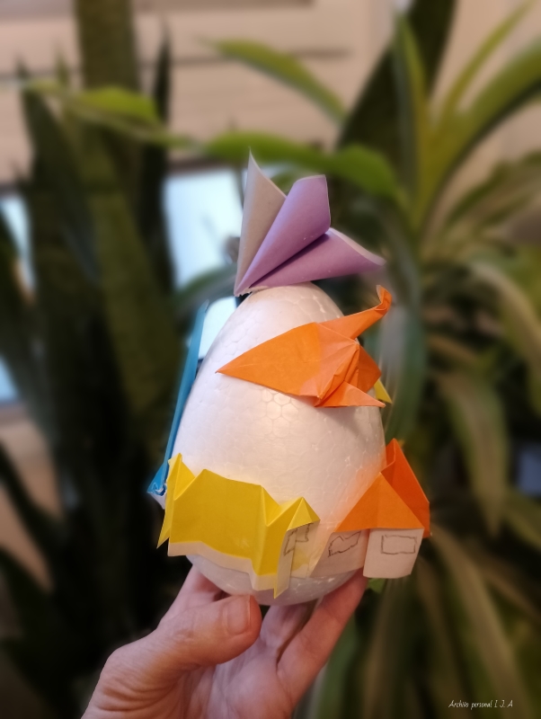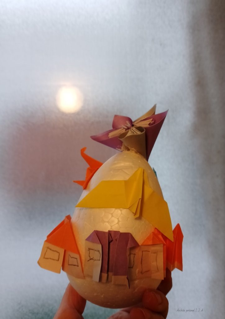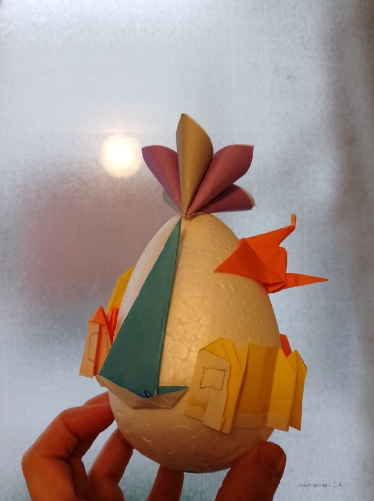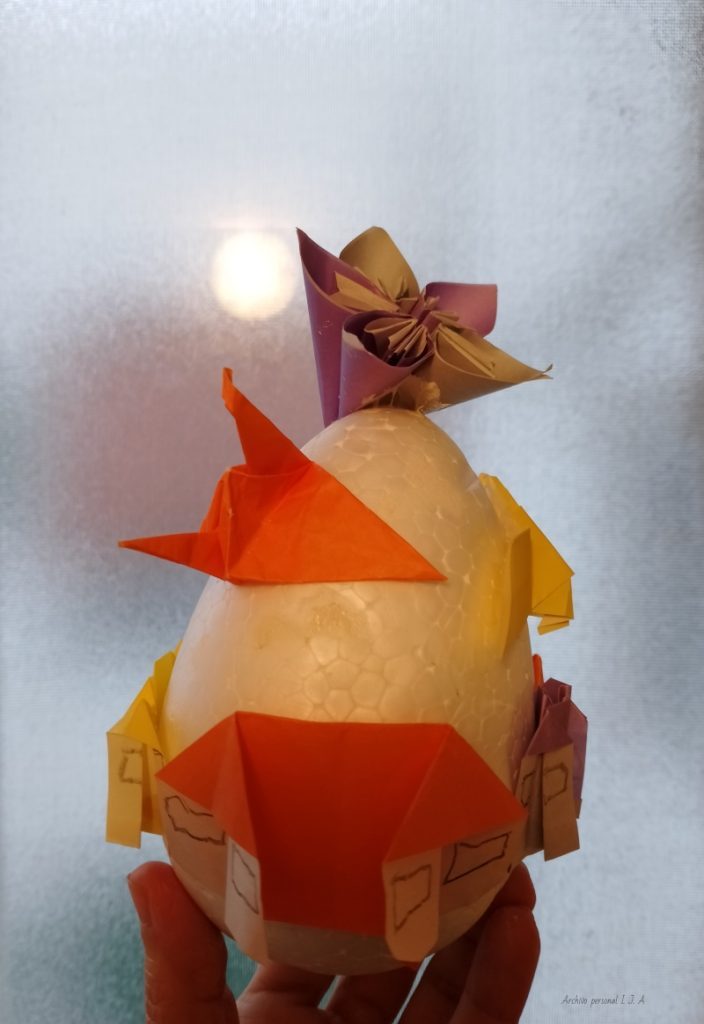 Una propuesta es la que veis en las fotografías. Se trata de hacer varias figuritas de origami y luego pegarlas a una figura mayor de poliestireno, que puede ser una pirámide, un cono o un ovoide. En la parte más estrecha colocaremos un motivo principal y en la de abajo otras figuras que lo apoyen. En este caso, en la parte de arriba se ha pegado una flor y en la de abajo unas casas o edificios y un barco.