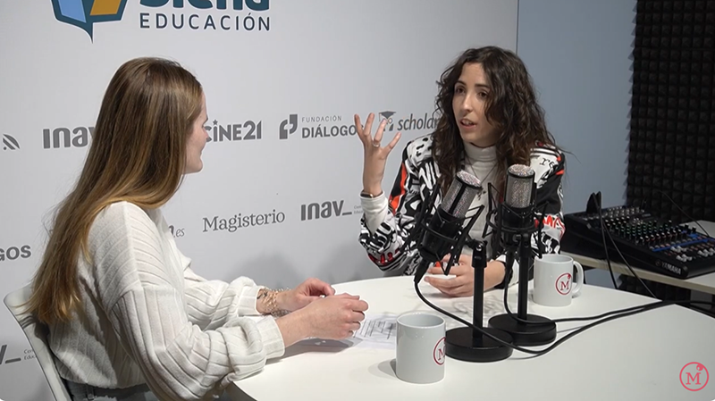 Paola Roig (derecha) charla con Marta Peiro (izquierda) en el estudio audiovisual de Magisterio. ®MAGISTERIO.