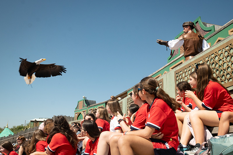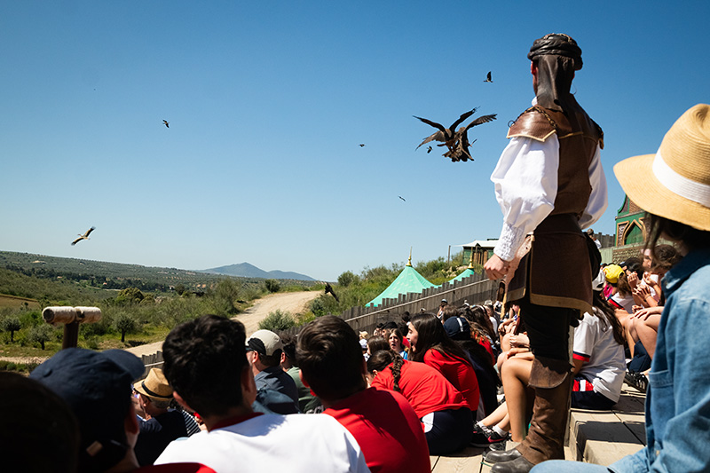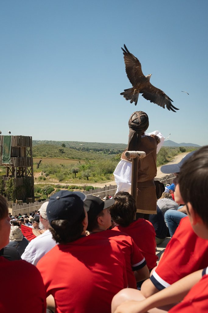 El primero de los espectáculos nos hace mirar al cielo, donde la Academia de Cetrería de Puy du Fou nos tiene preparada una representación que nos remonta a 939, año de la Batalla de Simancas, en plena Reconquista cristiana. Mientras por el escenario desfilan personajes como el califa Abderramán III, su hija Salama y el castellano Fernán González, las aves copan el protagonismo: águilas, halcones, buitres, lechuzas, cigüeñas… y así hasta 200 aves que vemos por detrás de nosotros, por arriba, o incluso posadas sobre nuestra gorra, “tan cerca que da miedo”, según los alumnos, mientras Irma Iglesias, tutora de 2º C, mira impresionada los guantes “destrozados” de los cetreros.