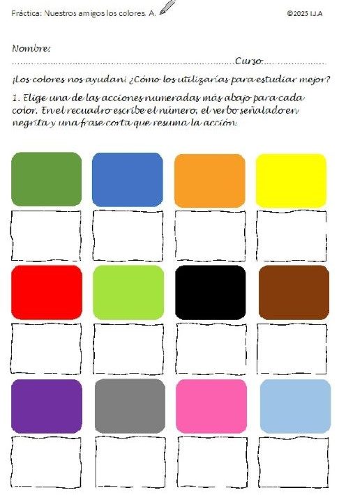 Entonces, para que nuestros alumnos y alumnas aprendan a utilizar mejor los colores al estudiar, podemos utilizar una plantilla como la siguiente: Nuestros amigos los colores.  Consiste en un ejercicio dividido en tres partes.