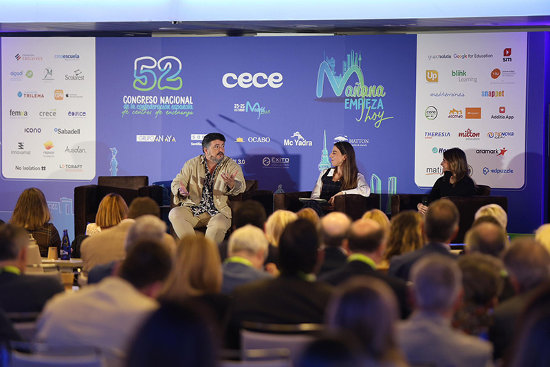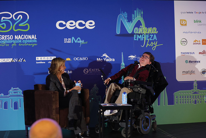 La conversación entre Andrés Marcio y la periodista Marta Barroso, celebrada en el 52º Congreso de CECE, se convirtió en uno de los momentos más emotivos del encuentro. A través de su testimonio, Andrés –afectado por una enfermedad rara degenerativa— y Marta —su amiga y narradora de camino— ofrecieron una reflexión profunda sobre el valor de la vida, la dignidad, la amistad y el poder transformador de la escuela. A continuación, se entregaron los reconocimientos CECE a los Valores Sociales, que pusieron el foco en la solidaridad, la esperanza y el compromiso educativo.